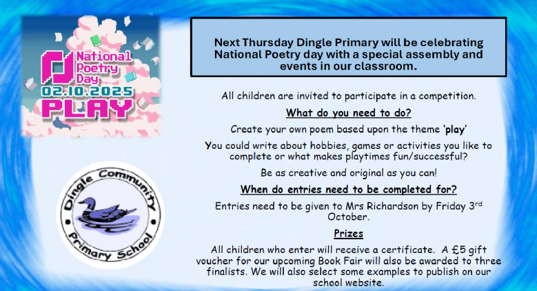 If anyone is able to volunteer any time to support any of our DPP (Dingle Parent Partnership) events, please email info@dingle.dudley.sch.uk or call on 01384818305.