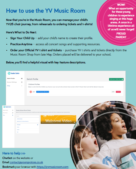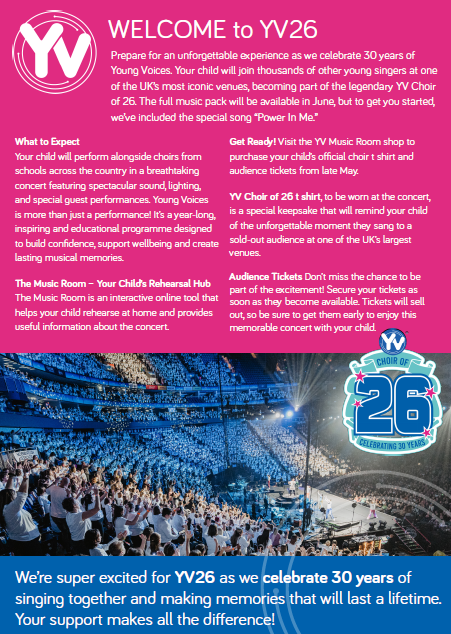 Firstly, can I say a huge thank you to yourselves and your children for their enthusiasm and excitement towards our Young Voices concert. It really is going to be such a memorable experience for us all.